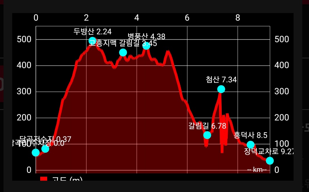 -4.38-병풍산-6.78-매곡재-7.34-첨산-8.5-흥덕사-9.27-장덕교차로