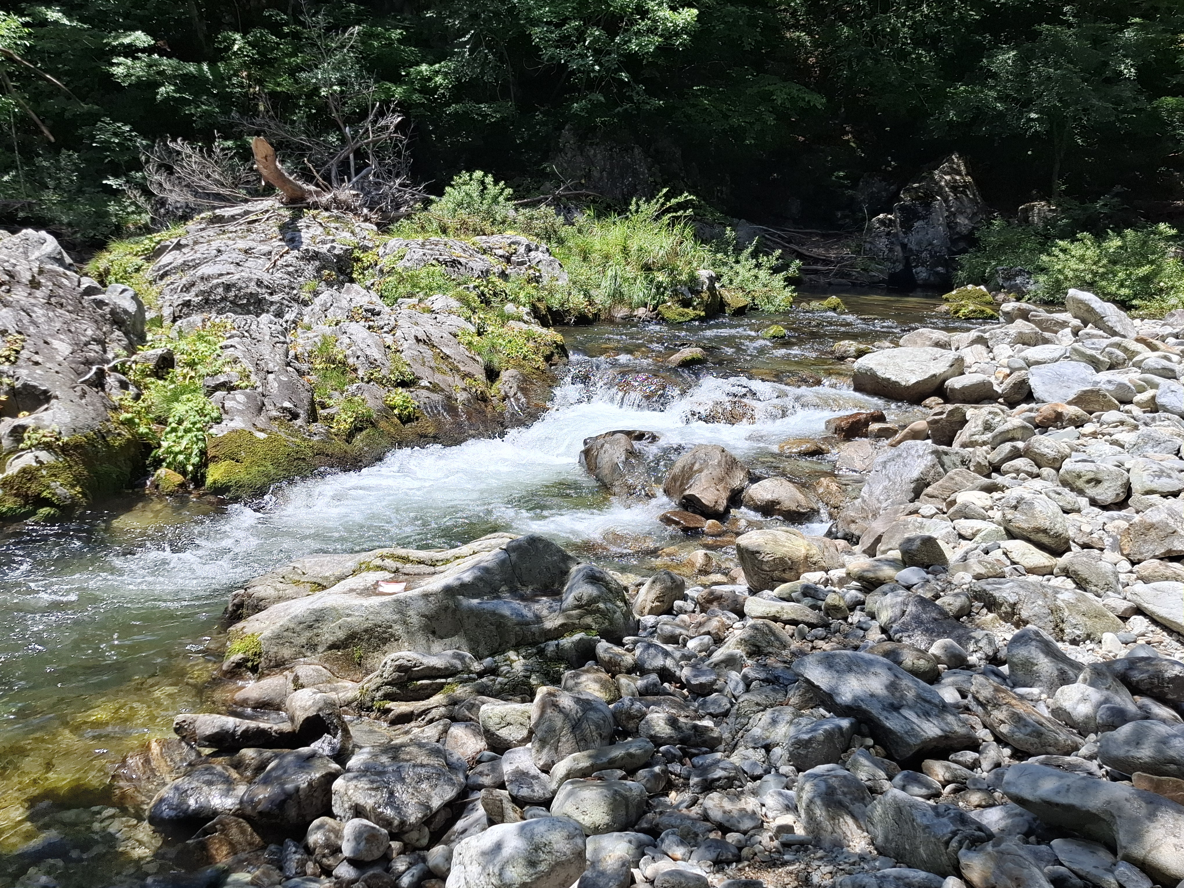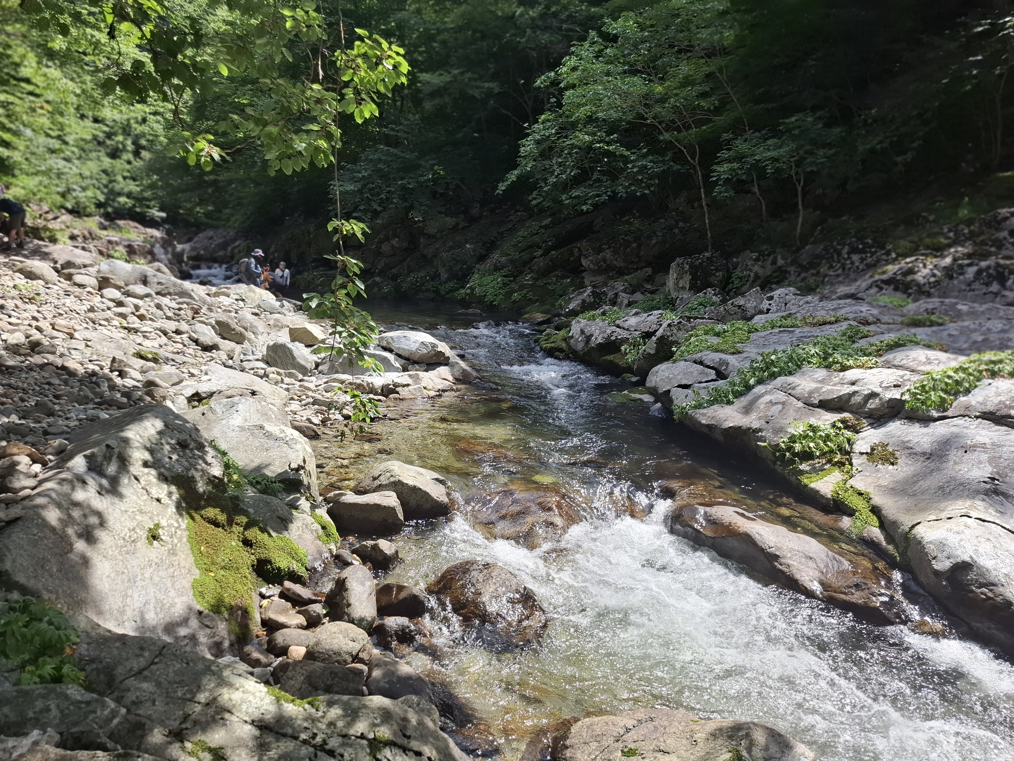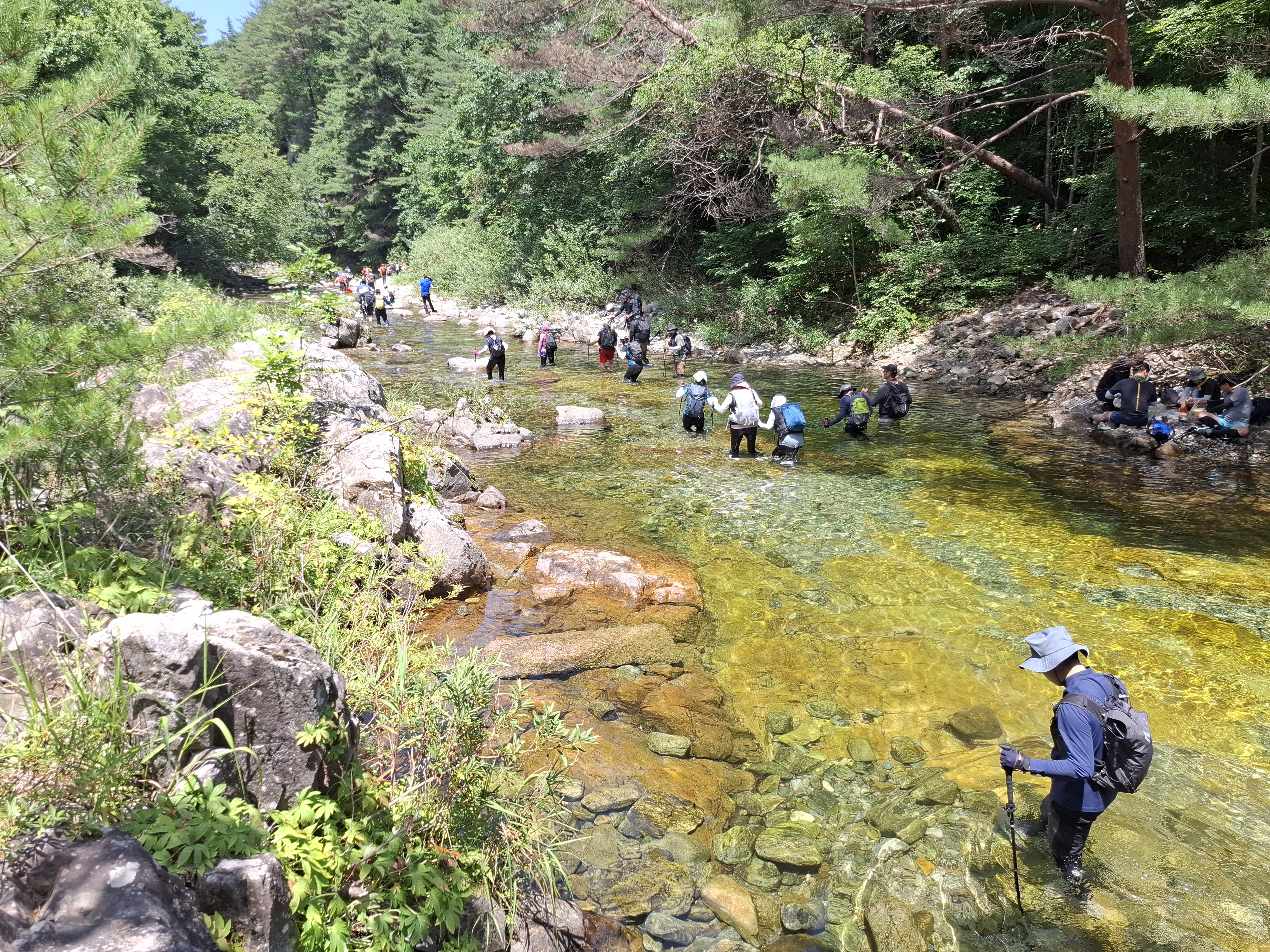 아침가리골은 바닥까지 비치는 투명한 옥빛. 계류 속에서 노니는 물고기떼, 색과 무늬가 다양한 바위와 조약돌이 깔린