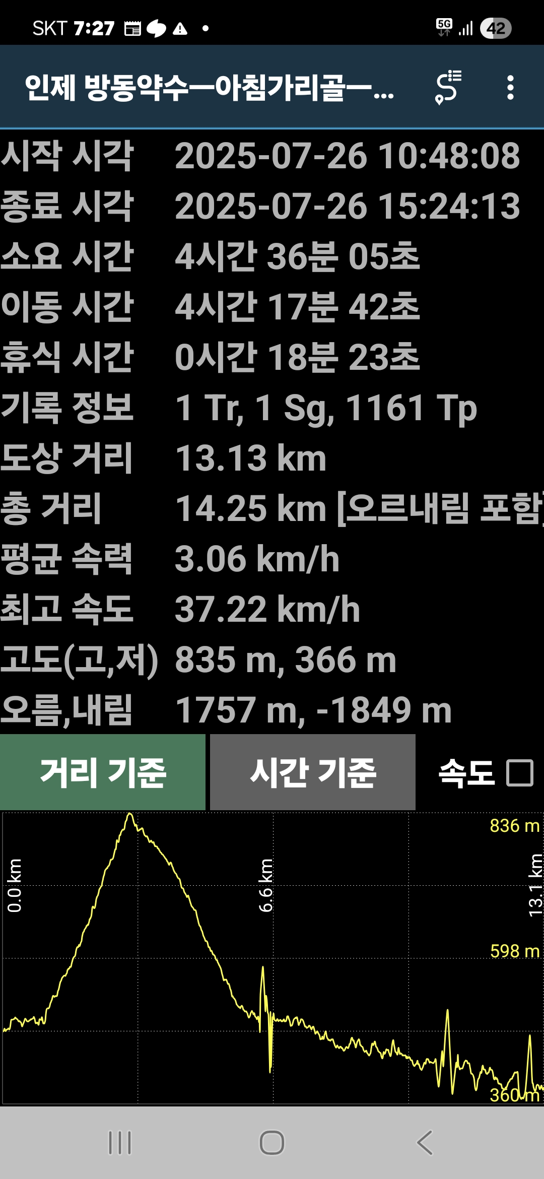4. 시간과 거리; 4시간 36 분 GPS 12.4 km (램블러 기록)