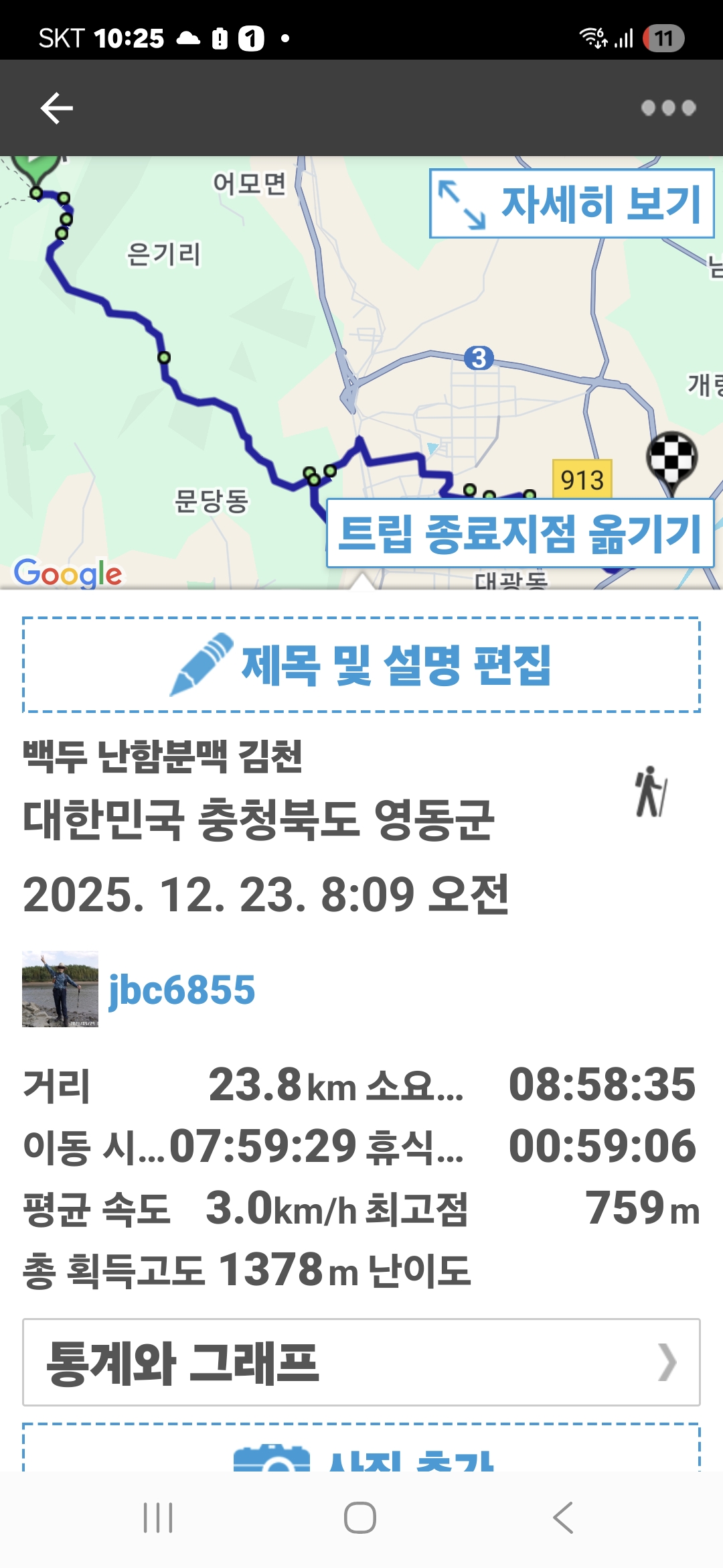 4. 시간과 거리; 8 시간 58 분 GPS 23.8 km (약 2km 공제)