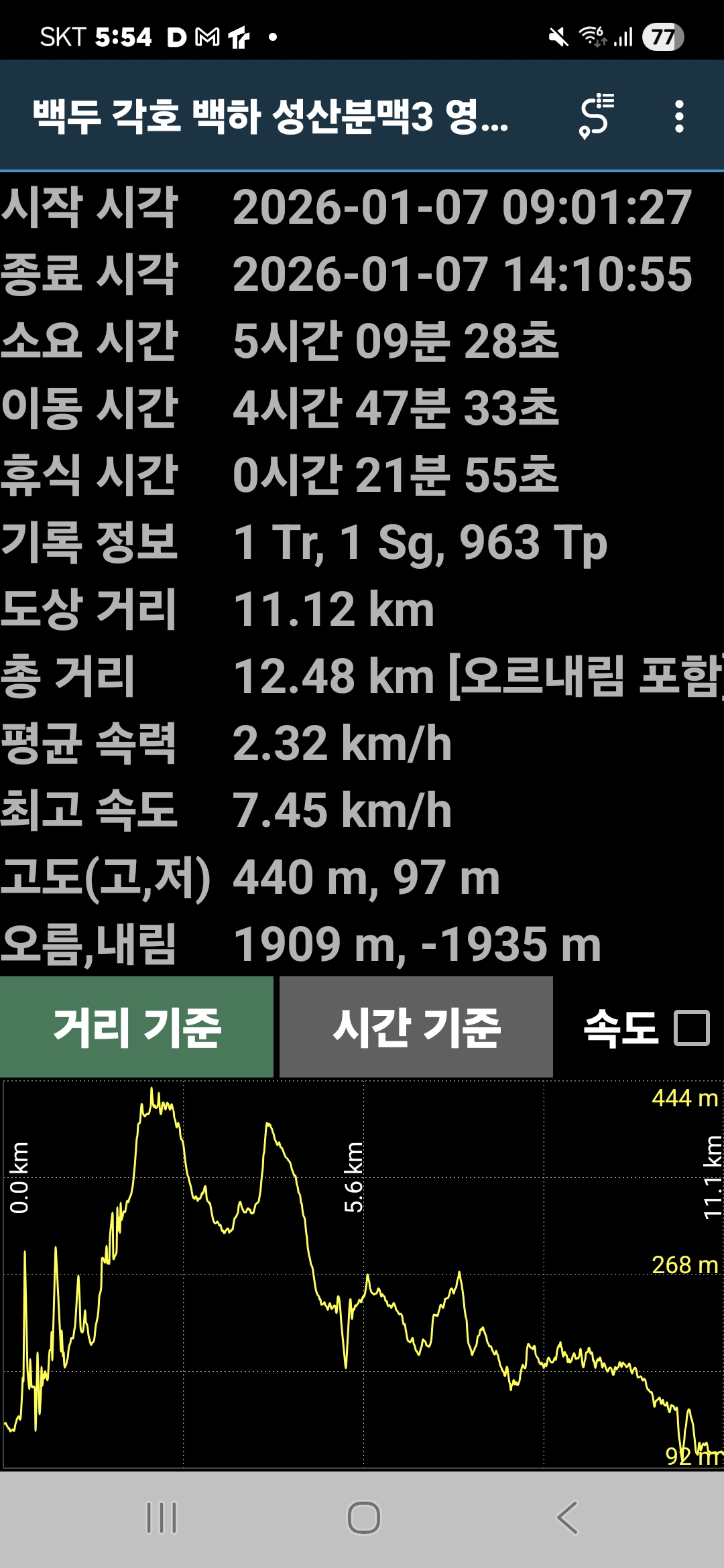 4. 시간과 거리; 5 시간 09분 GPS 10.7 km (램블러 기록) (마루금 9.0k+접속1.7k)