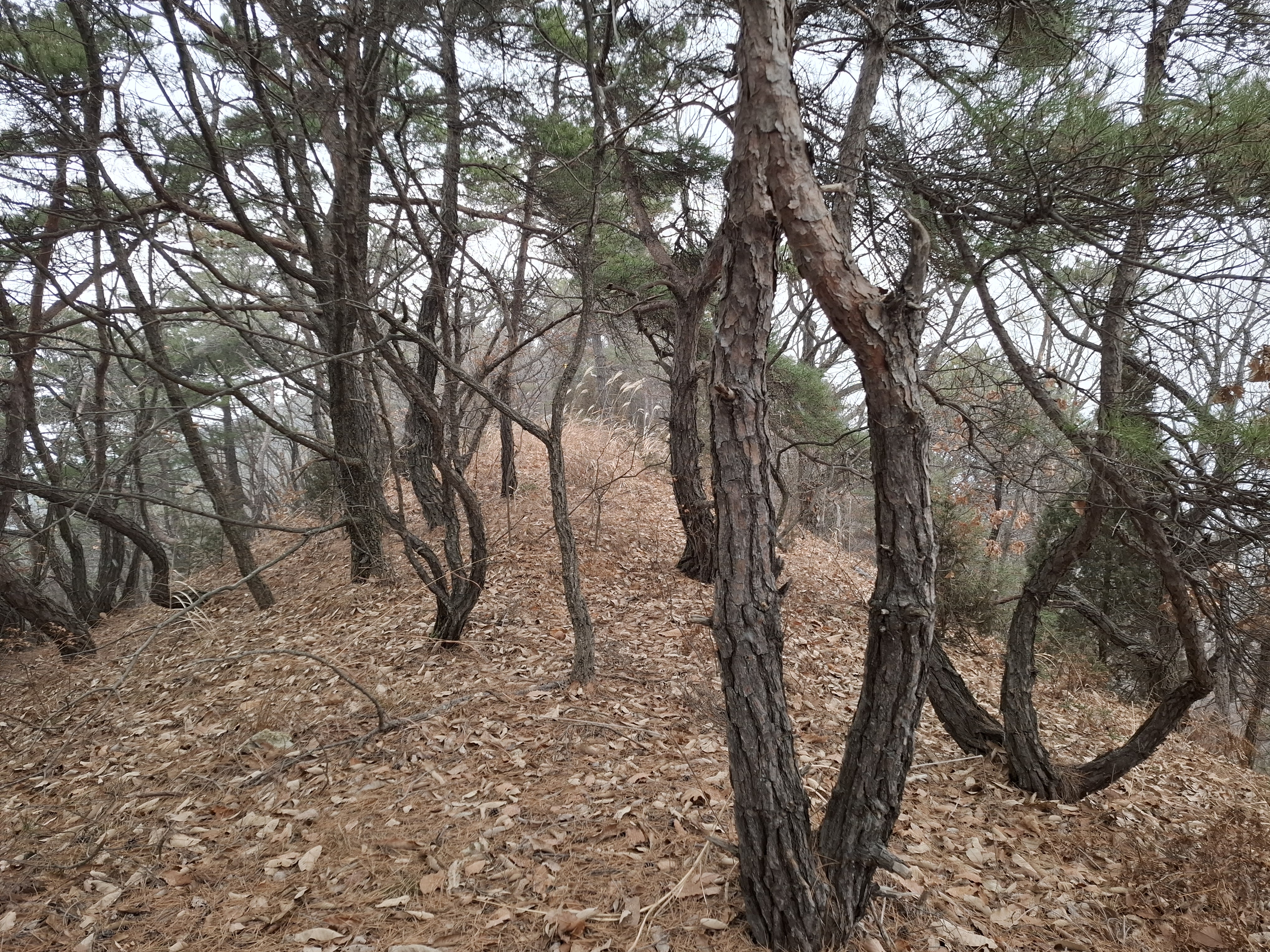 1;35 고당교 절개지. 낙엽이 쌓이고 급경사 하산길로 미끄럽다.