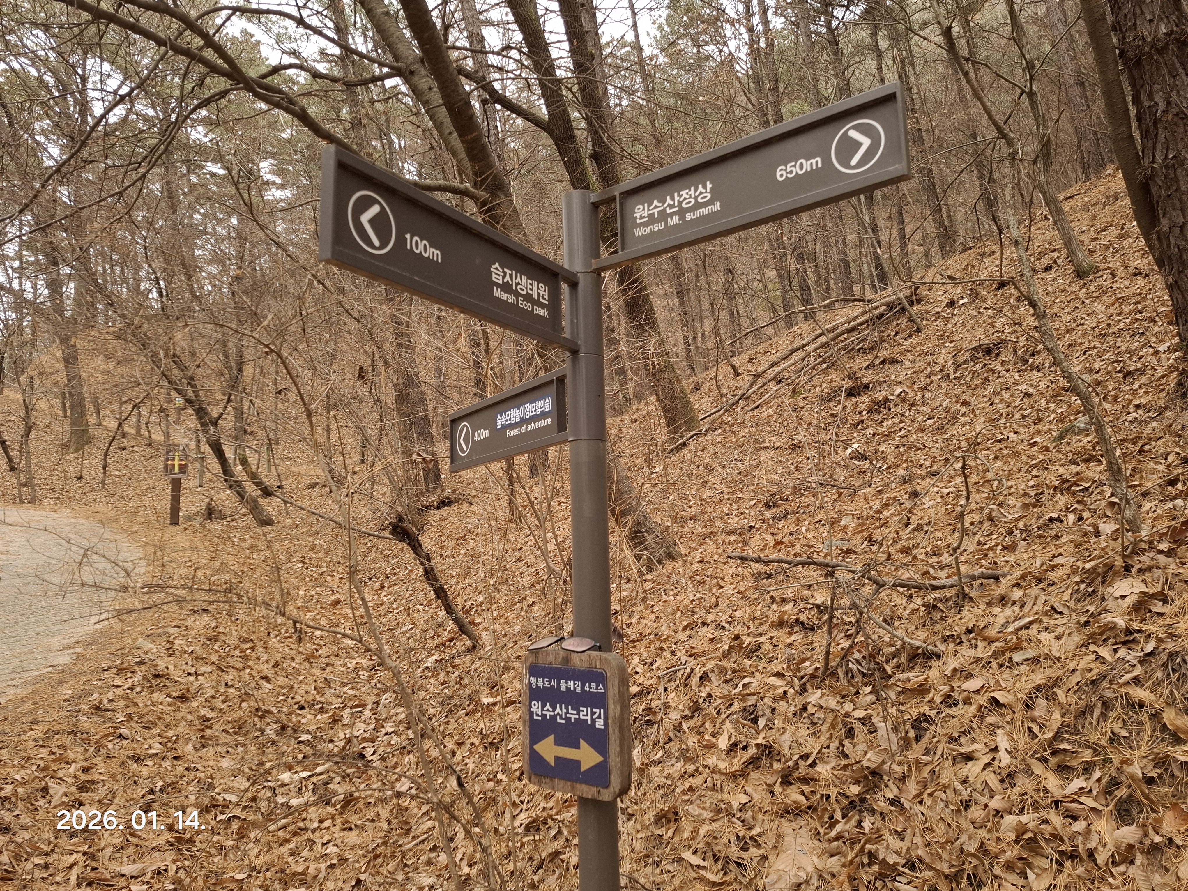 4;43 갈림길. 남부소방서1.25k/원수산400m/덕성광장700m/습지생태원60m