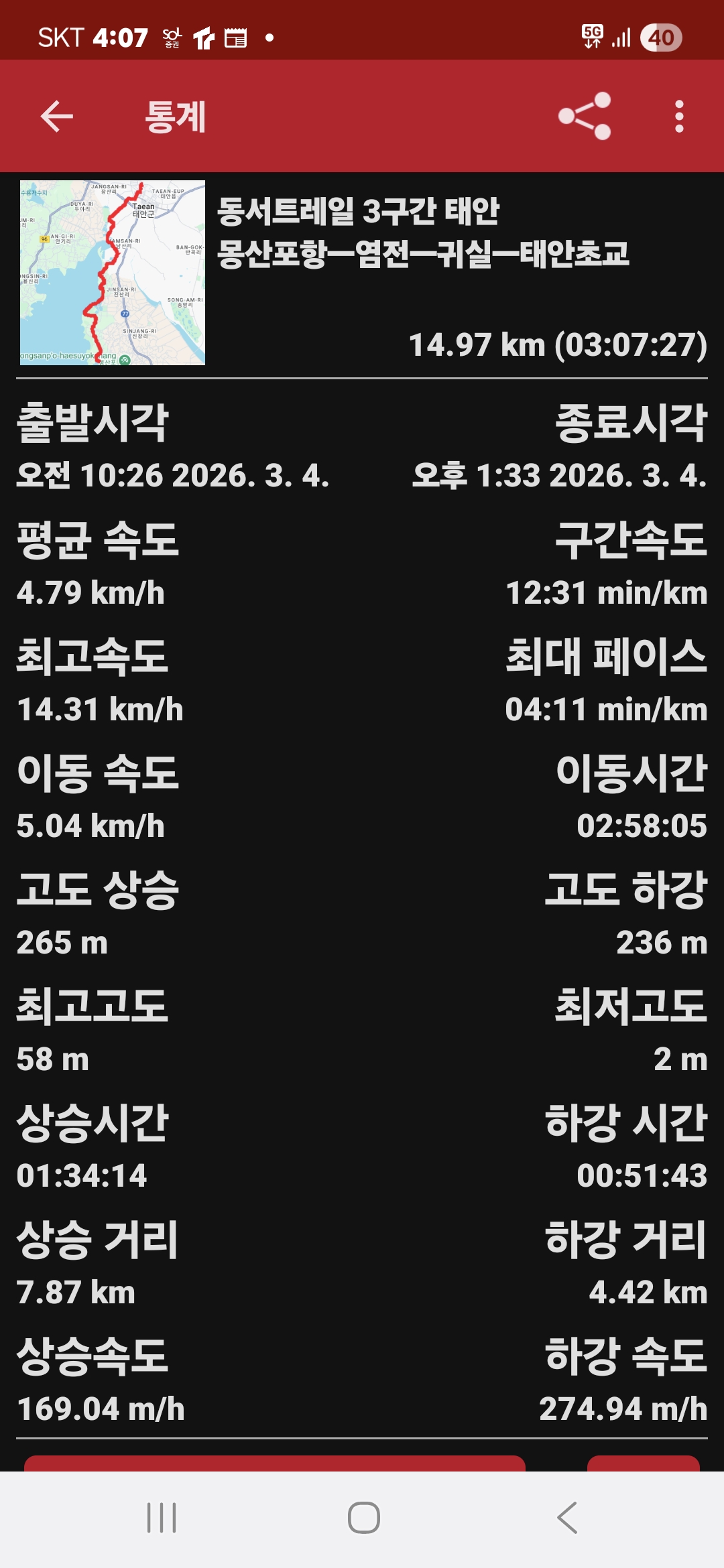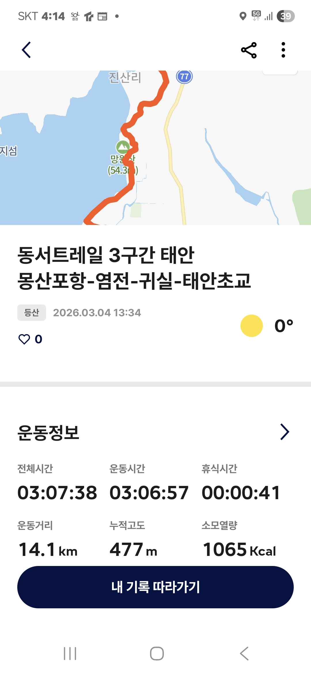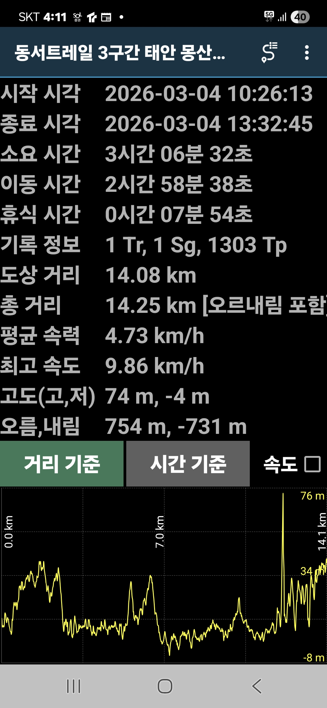 4. 시간과 거리; 3시간 7분 GPS 14.1 km (트랭글 기록)
